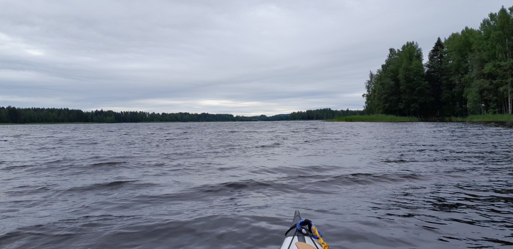 Heute wollte ich eigentlich einen Ruhetag einschieben. Der Wetterbericht hat aber immer wieder Regenschauer angegeben. Denn ganzen Tag im Zelt? Da hab ich das Kajak gepackt und bin diesmal mit Rückenwind nach Kuopio gepaddelt. Also ich habe mich mehr treiben lassen, ein kleines Segel hat mir geholfen. Den ganzen Tag kein Regen aber schweinekalt. Ich habe alles angezogen, was greifbar war.